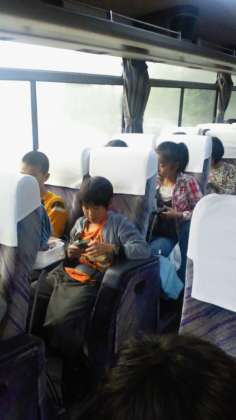 ハイキングの途中、戦場が原の一番景色のいいところで、日差しがさしてきました。美しい景色に歓声があがりました。でも赤沼に着いたとたんにどしゃ降り。運がよかったです。バスのなかのお弁当タイムです。これから遊覧船に乗ります。