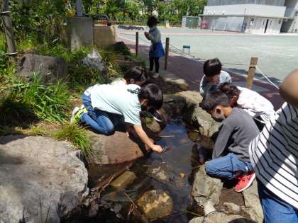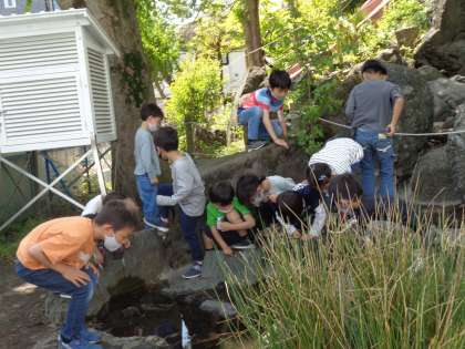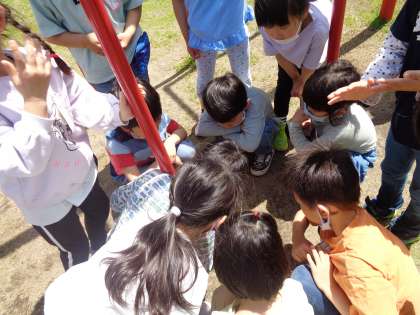 生活科「はるをさがそう」です。教室で予想をしてから、校庭に春を探しにいきました。「てんとうむしの幼虫だ!」「たんぽぽが綿毛になっている!」山野の山でのたくさんの発見に、大興奮でした。振り返りでは、花や昆虫は季節ごとに違うことに気づきました。