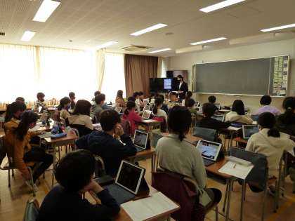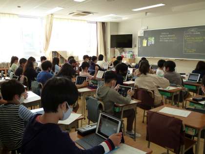 タブレットでオンライン授業を想定して「Zoom」の使い方を確認しました。SNSマナーの再確認やオンライン授業での注意点を学年全員で画面を見ながら学びました。
