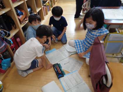 1年生との学校探検に向けて、グループで最終確認をしていました。
