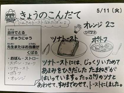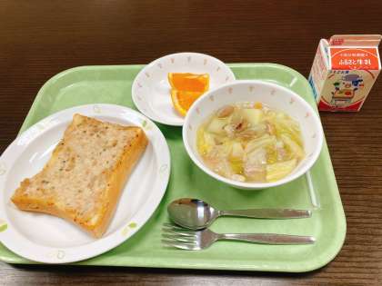 今日は、ツナトースト、ポトフ、オレンジ、牛乳です。