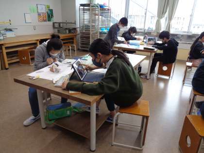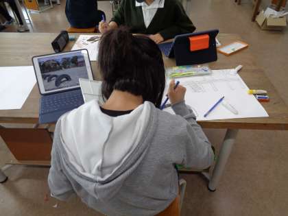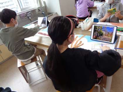 図工「季節をかんじて」タブレットの画像を見ながら、自分が選んだ学校の様子を集中して描いていました。