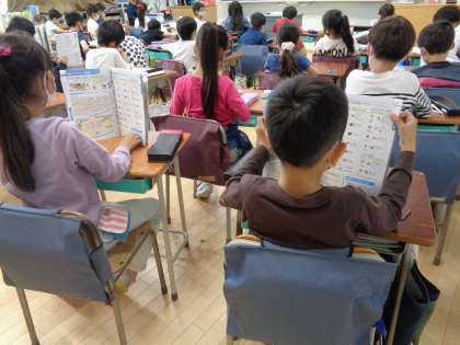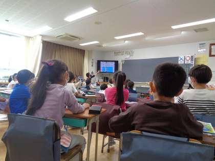 社会科の授業です。地図記号を学習しました。記号の形から意味を考えたり、地図の中の地図記号を探したりしました。