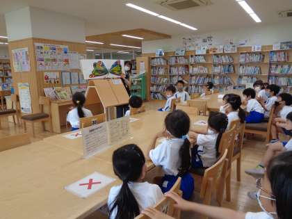 1年生の図書の様子です。図書室の利用が今回で2回目になります。今日は、司書の先生の読み聞かせがありました。みんなが集まることができないので、大型絵本を読んでもらいました。