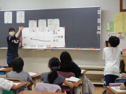 登場人物の心の距離をグラフ(心情曲線)に表し、関係の変化について考えました。初めは心の距離が大きかった登場人物の二人でしたが、様々な出来事を通してお互いの心の距離が近づいていったことを読み取りました。