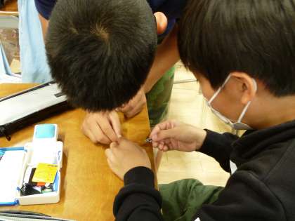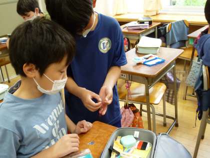 5年生のクラスでは、針に糸を何回も通したり、玉結びを作ったりと、裁縫の道具に慣れ親しむ活動に取り組みました。玉結びの作り方に苦労していましたが、できた子たちがミニ先生になって教えてくれたおかげで、できるようになった子が増えました。