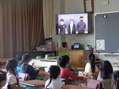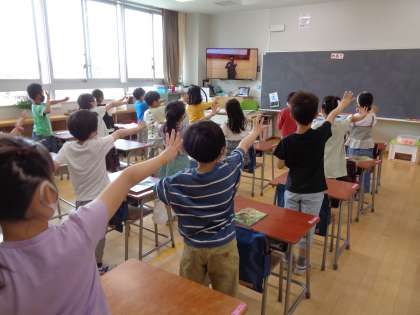 今日は、体育朝会でした。体育委員さんが「ちょこっと運動」といって、その場でできる簡単な運動を紹介してくれました。体育委員さんの動きに合わせて、みんなでその場でやってみました。