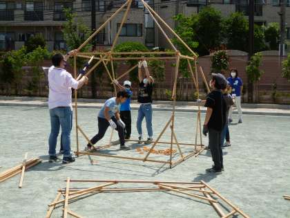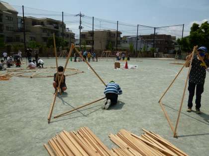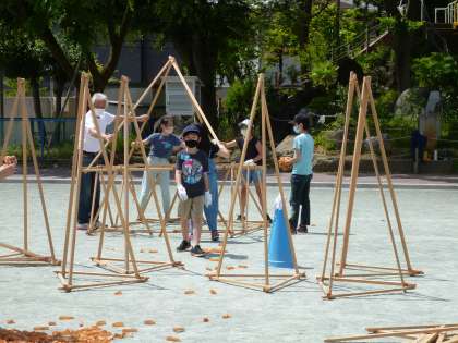 まずは、角材と角材を輪ゴムでどのように止めたらよいかに悩みながら、各自でたくさんの三角を創っていました。その後、建物の大きさをどのくらいにするかみんなで確かめたり、創った物を合わせて組み立てたりして少しずつ大きな建物になっていきました。