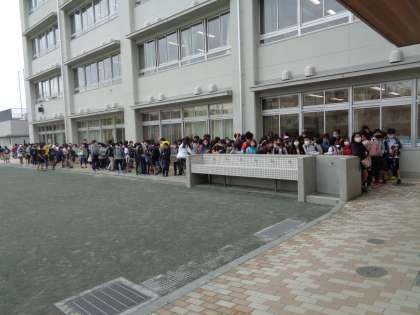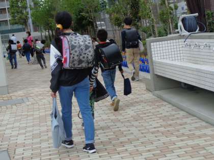 月曜日の朝です。たくさんの荷物を持っての登校です。体育着・上履き等、手提げ袋に入れて1つにまとめて持つと、安全ですね。