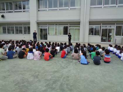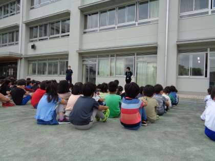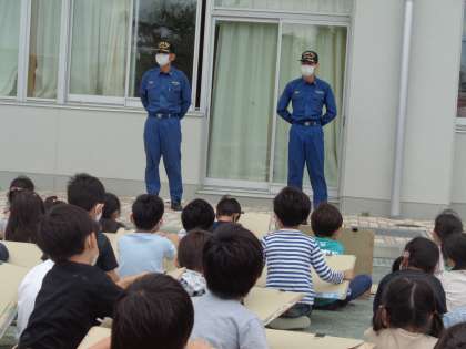 まず、消防署の方々に挨拶をしました。風が強い中でしたが、話を聞く1年生の姿勢が本当に立派でした。