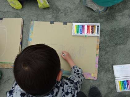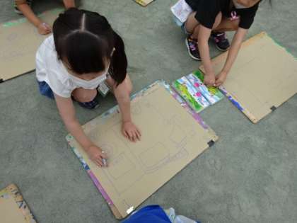 画用紙に、白やグレーのクレパスで消防車の形を描きます。大きく描いて、迫力満点です。