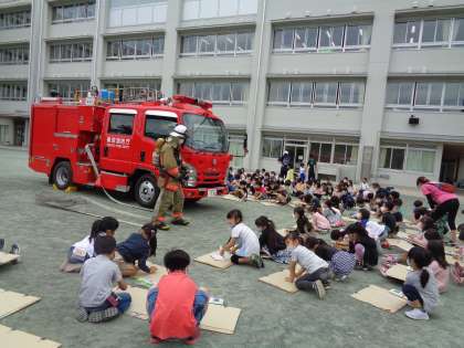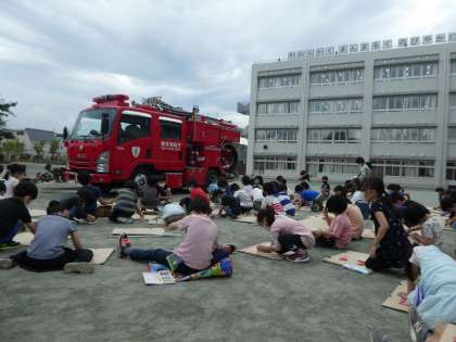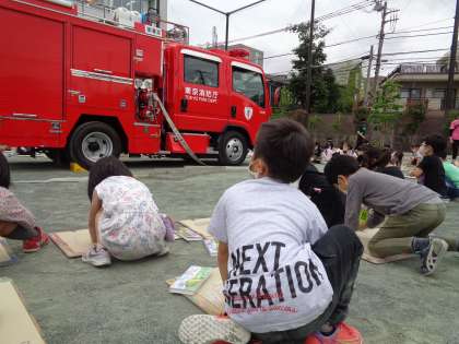 こんなに間近で消防車を見られることは、そうありません。1年生は、真剣に一生懸命描いていました。