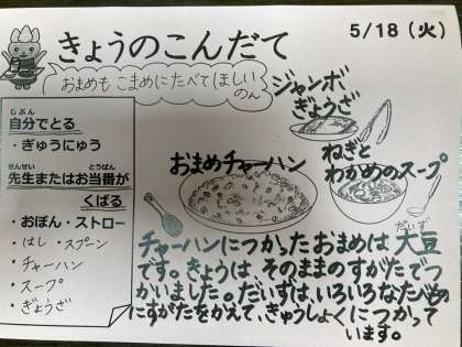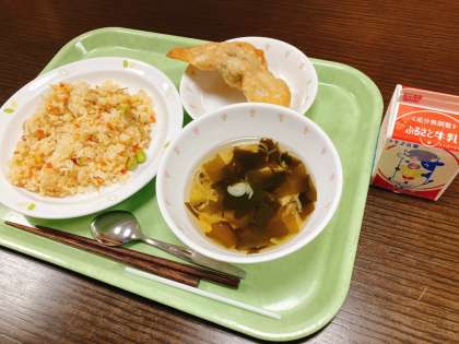 今日は、おまめチャーハン、ジャンボぎょうざ、ねぎとわかめのスープ、牛乳です。