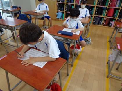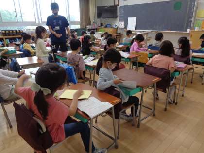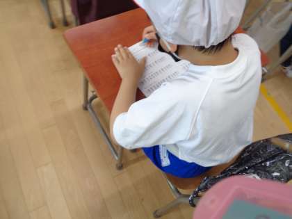 みんな揃って、昨日の宿題の確認をしている様子です。1年生の朝の支度もとても早くなりました。
