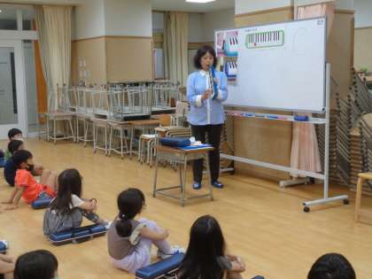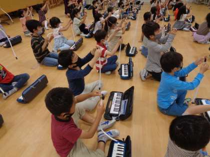1年生が鍵盤ハーモニカの講習を受けていました。講師の先生が「おもちゃのチャチャチャ」を演奏してくれて、すてきな音色に感動していました。