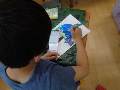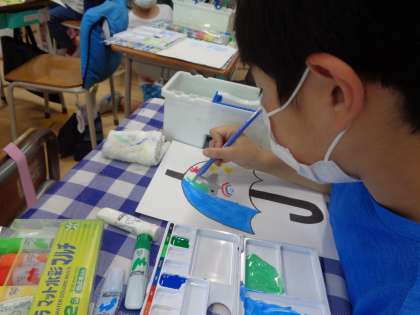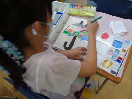 2年生の図工です。傘にクレパスで絵を描いて、水彩絵の具で塗っていました。オリジナルのすてきな傘がパッと開いてきれいです。