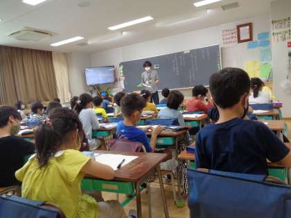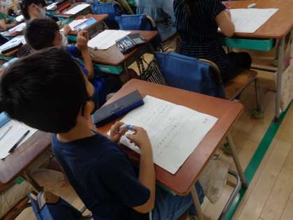 2年生の日本語です。「論語」を学習しています。白文と書き下し文を比べて違いを考え、気付いたことを発表しました。友達の発表をよく聞いて、考えていました。