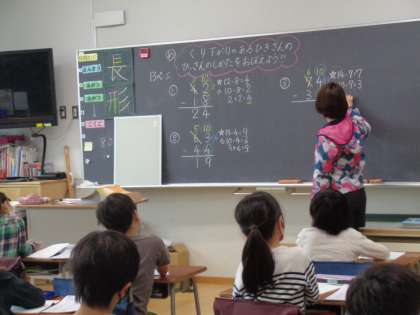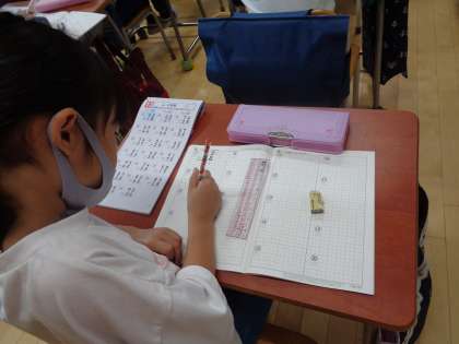 2年生の算数の様子です。繰り下がりの引き算の筆算の仕方を確認しながら、問題を解いていました。繰り返し行うことで基礎の力が身に付いていきます。