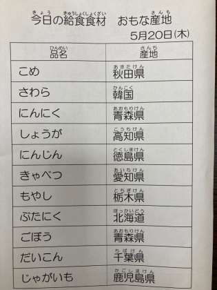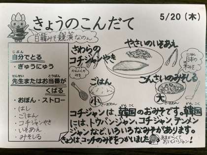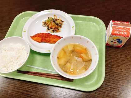 今日は、ごはん、サワラのコチジャン焼き、野菜の磯あえ、根菜のみそ汁、牛乳です。