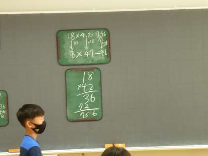 5年生の算数「小数のかけ算」です。計算の仕方を発表し、検討しています。これまで学習してきたことを使い、考えていました。このような学習が算数的思考を育んでいきます。