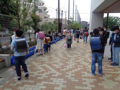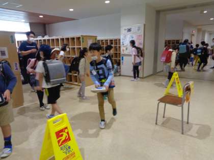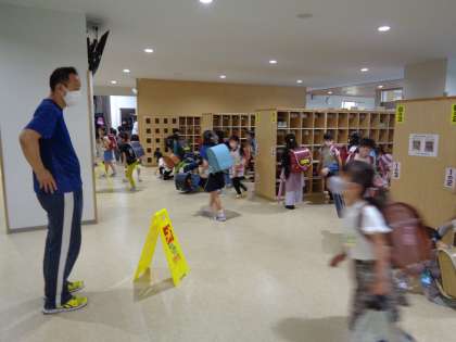 今日の朝は、雨模様。湿気で床が濡れていました。山野小の子供たちが滑って転ばないように、立て札を立てたり、先生達が声をかけたりしました。
