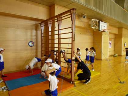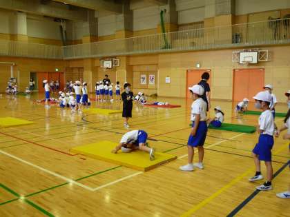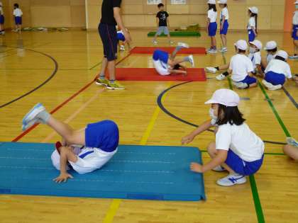 2年生が、体育でマット運動をしているところです。グループで協力しながら進めることができるようになり、終わった人が次の人に「オッケーです。」と言って合図もしっかり送って取り組んでいました。えんぴつまわり・前転・後転・倒立などいろいろな技に挑戦しています。