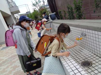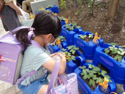 月曜日の朝です。1年生は、真っ先にあさがおに向かいます。たっぷりのお水をあげて、嬉しそうです。