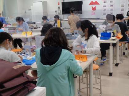 6年生の家庭科です。2学期の「マイバッグ」作りに備えて、布を使った小物作りをしています。5年生での裁縫を復習しながら、取り組みました。