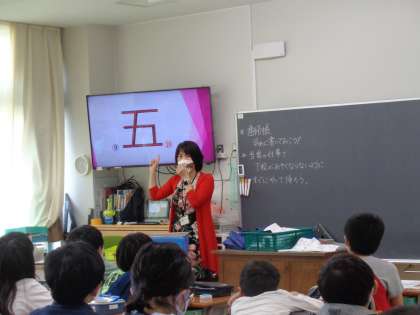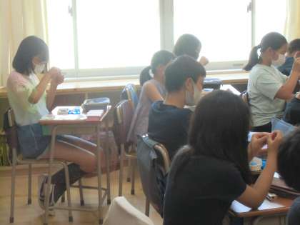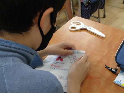 5年生の家庭科です。裁縫に取り組んでいます。練習布に五の字を糸で縫っています。