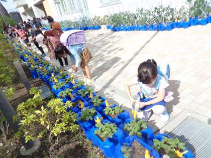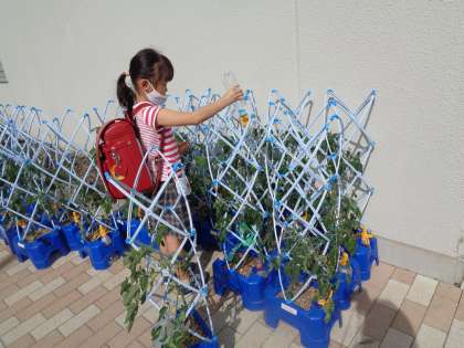 今日も暑くなりそうです。あさがおやミニトマトが水をかけてもらって、気持ちよさそうです。
