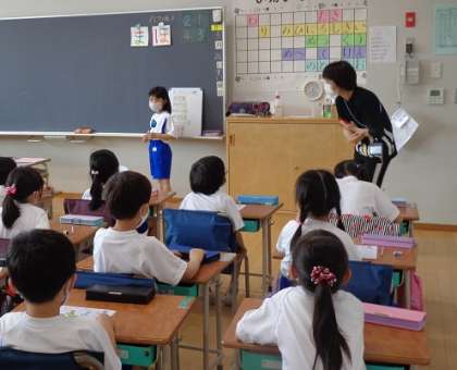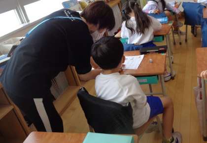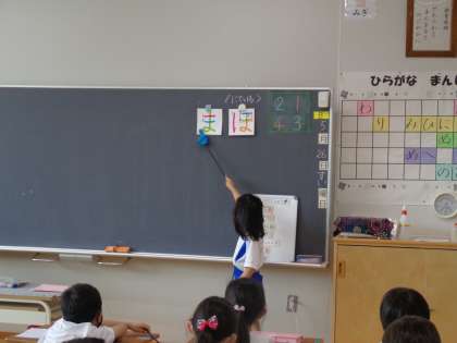 「ほ」と「ま」の似ているところを発表しています。みんなで考えて、文字の形を正しく捉えます。
