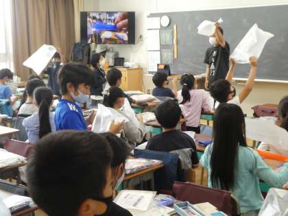空気を袋に入れて、感触を確かめました。反発したり、やわらかさを感じたりと、空気の存在を実感しました。