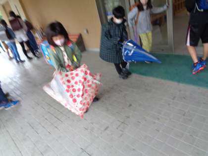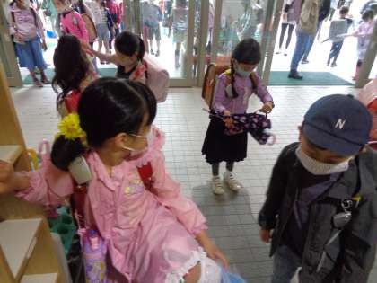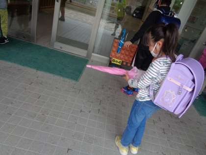 どの子も傘をたたむ時に水を払っていました。「誰かに教えてもらったの?」と聞くと、「やってたの見たから・・・」