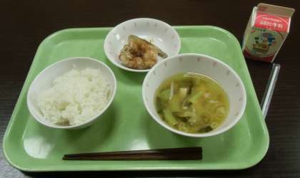 今日のメニューはごはん、ねぎだれからあげ(とりにく・こいわし)、豆腐と小松菜の味噌汁、牛乳です。