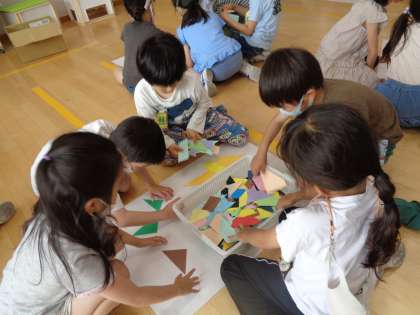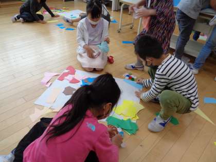 いろいろな色や形の画用紙を並べて、イメージをふくらませながら、形を作ります。