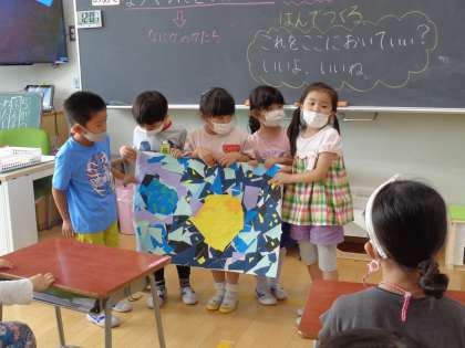 班で協力することも課題でした。友達と相談しながら、模造紙に1つの作品を仕上げました。