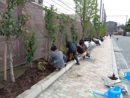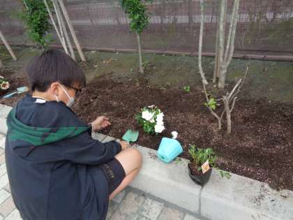 園芸委員会は、花壇に花を植えました。