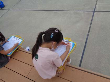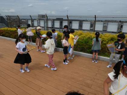 「屋上広場」にも行きました。富士山が見えたり、小田急線のロマンスカーが通ったり、山野小ならではの景色に歓声があがりました。
