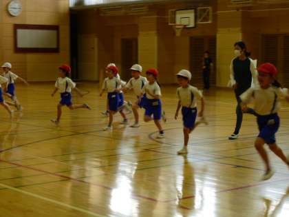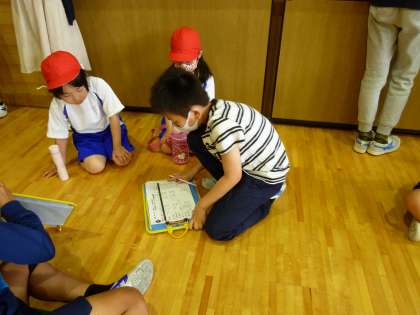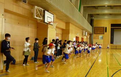 体育館では、1年生のシャトルランの計測がありました。6年生が回数を数えて、記録用紙に書いてくれまいした。また、1年生がちょうどよいペースで走れるように、一緒に走ってくれました。
