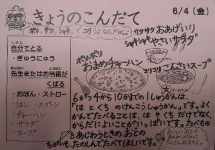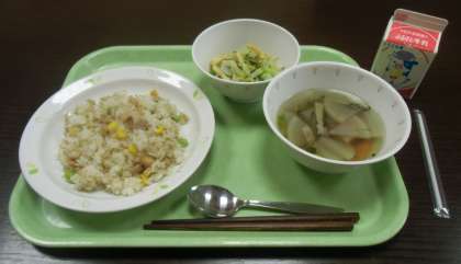 今日のメニューは、ポリポリおまめチャーハン、サクサクおあげ入りシャキシャキ野菜サラダ、コリコリ根菜スープ、牛乳です。