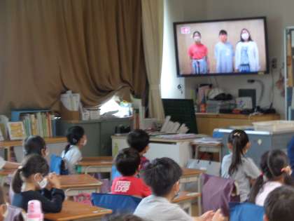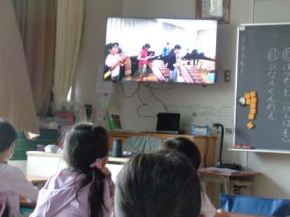 今日は、音楽朝会がありました。全校児童が集まることができないので、テレビでの朝会でした。