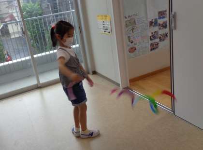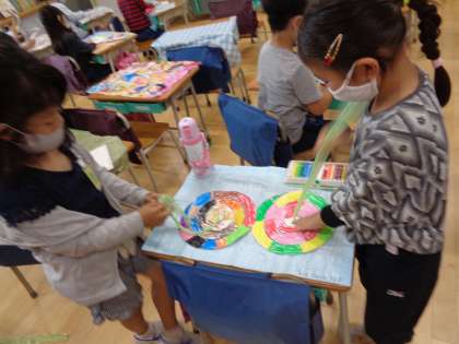 はさみでぐるぐる切って、ひもを結びます。そして、色を塗ると・・・