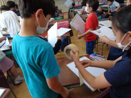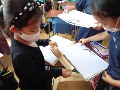 今日は、道具の名前や使い方を確認した後、「書写ばさみ」を作りました。書いた半紙を挟んでおくものです。友達と協力しながら、作っていました。「手伝おうか?」という声かけが自然にできていて、すてきでした。