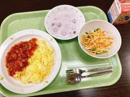 今日は、ターメリックライス、チリコンカン、ポテトチップスサラダ、ブルーベリーヨーグルト、牛乳です。