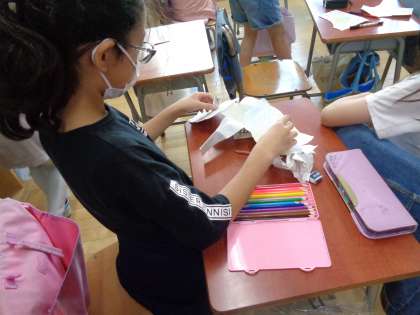 作品ができ上がって鑑賞会をしているクラスもありました。友達が作った、個性豊かに変身した牛乳パックを楽しそうに鑑賞していました。