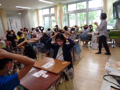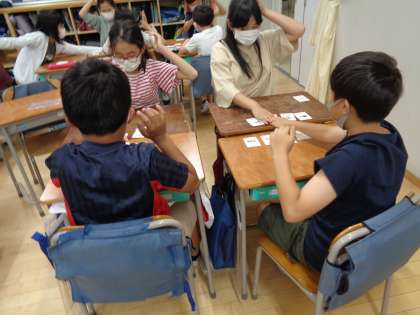 先生の後に続いて、繰り返し英単語を言います。キーワードの単語が言われたら、カードを取ります。ゲームをしながら、自然に英単語を学べます。とても盛り上がっていました。