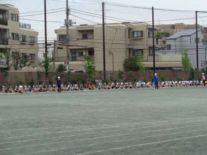 1年生は、5、6年生が校庭へ避難する様子を見学しました。