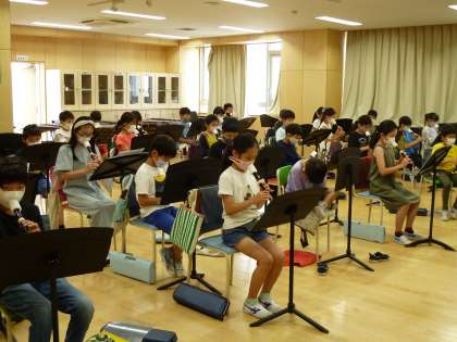 4年生の音楽です。感染症対策で、マスクを着けたままリコーダーを吹いていました。