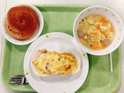 今日は、黒砂糖パン、マカロニグラタン、チェコのにんにく玉子スープ、牛乳です。