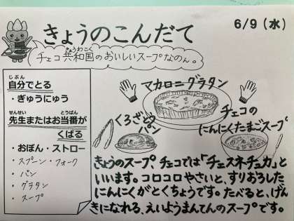 黒砂糖パンが黒パンの雰囲気で、ヨーロピアンな給食です。グラタンはフランス発祥のようです。なのでマカロニグラタンもイタリア発祥では無かろうに思います。チェコのにんにくたまごスープは、チェスネチュカというのですね。そうなんでチュか。